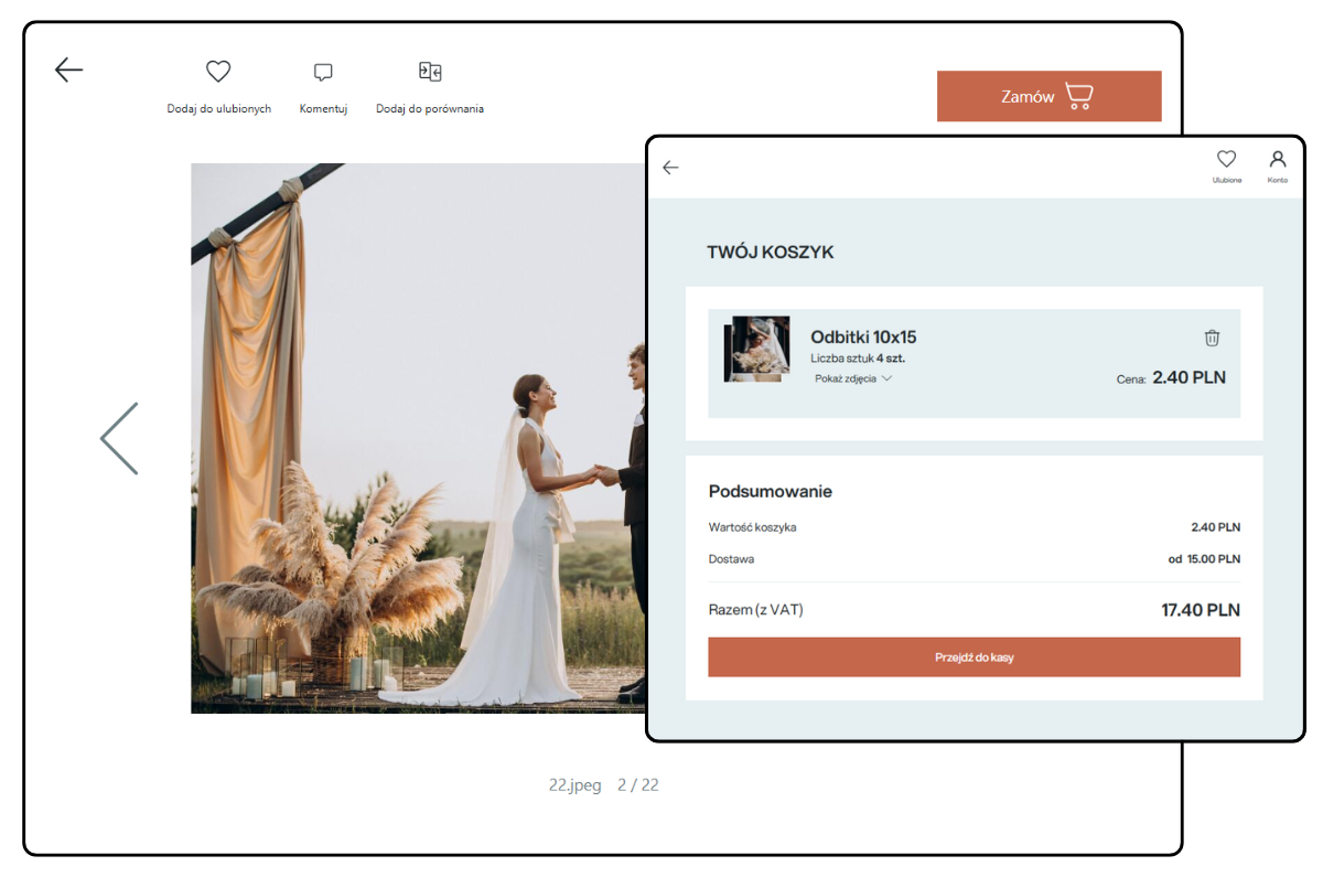 Dla Twoich klientów to przejrzysta, elegancka przestrzeń, gdzie w kilku kliknięciach mogą obejrzeć swoje zdjęcia, wybrać ulubione kadry czy zamówić gotowe odbitki. Dla Ciebie - oszczędność czasu i realne wsparcie sprzedaży.